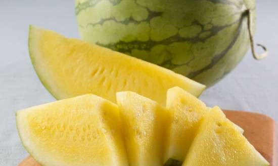 • mini watermelon in background d with cuts of yellow watermelon on wooden cutting board