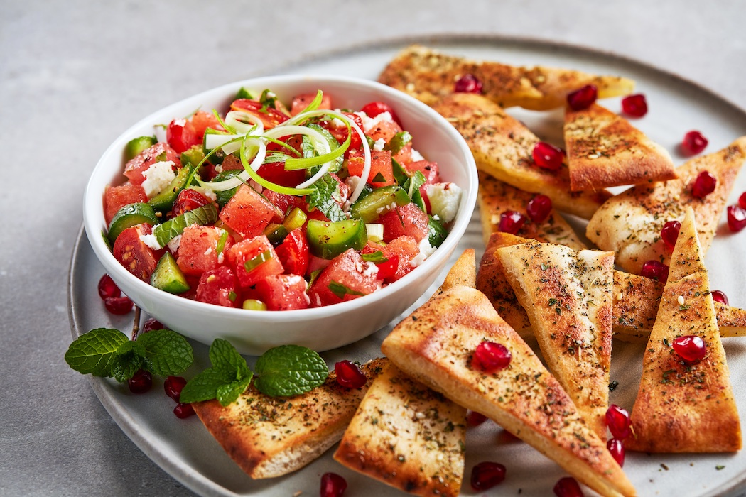 - Serve about 1 cup Watermelon Fattoush in a bowl surrounded by za'atar pita chips