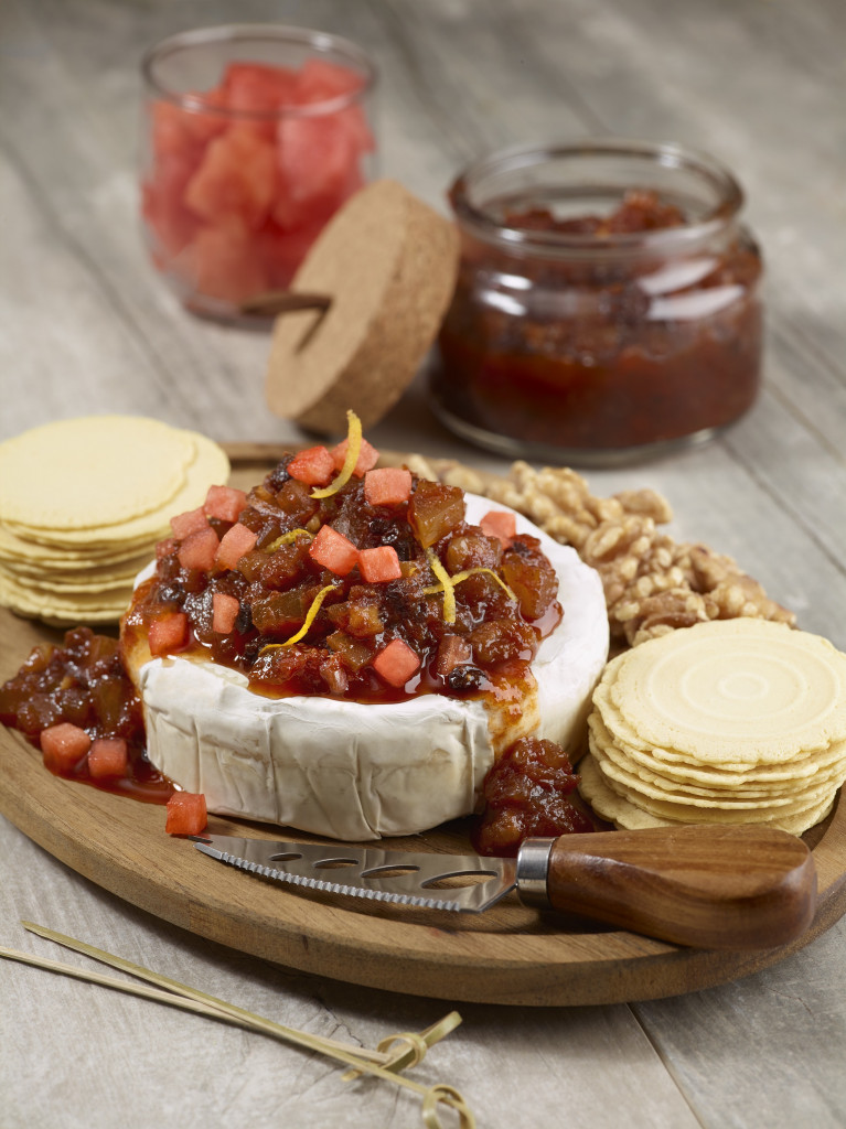 Surprise and delight your guests with this charcuterie board centerpiece. Sweet and savory watermelon chutney over a creamy wheel of brie is without a doubt a talk-of-town fall appetizer.